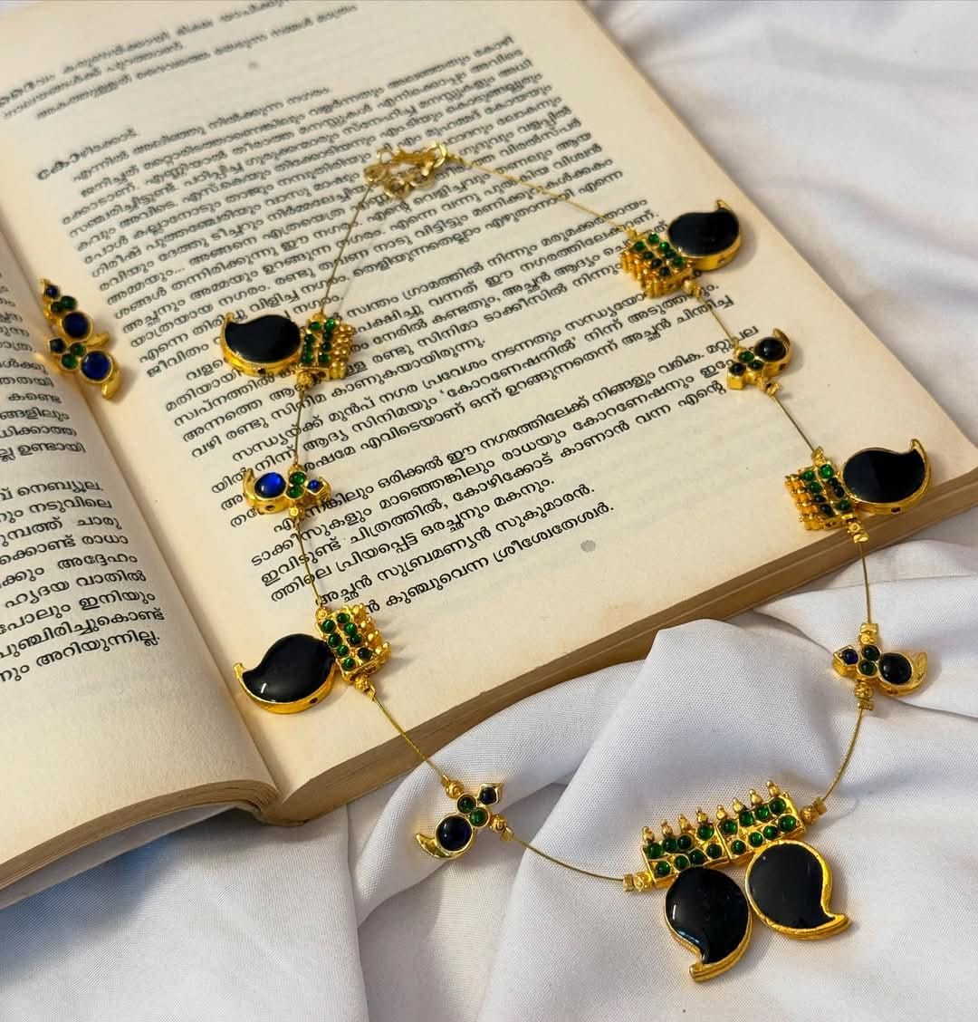 Enamelled Navi Blue Mango Charms And Kemp Pendants Necklace With Earrings